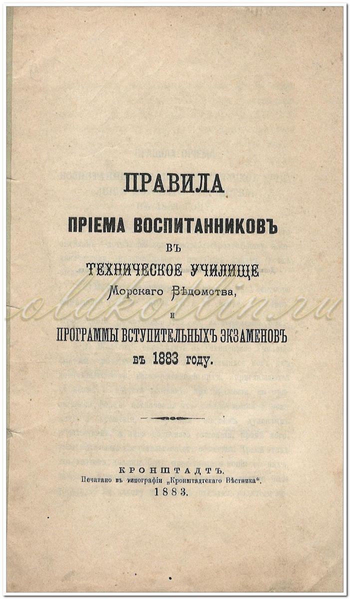 Правила приема воспитанников в Техническое училище Морского Ведомства 1883 г.