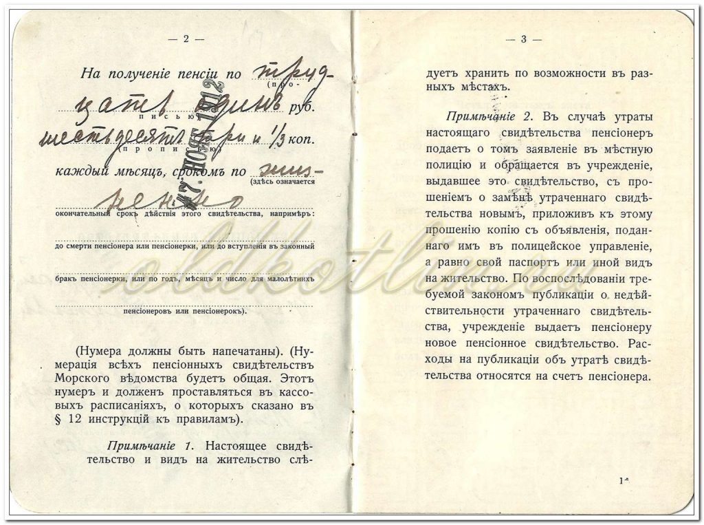 - При получении пенсий из самых учреждений Морского ведомства, для получения пенсии требуется представление только настоящего свидетельства и вида на жительство, а для доверенных, сверх того, и надлежащей доверенности, освобождаемой от гербового сбора. В получении пенсий пенсионеры или их доверенные должны расписываться в особых пенсионных требовательных ведомостях учреждения.