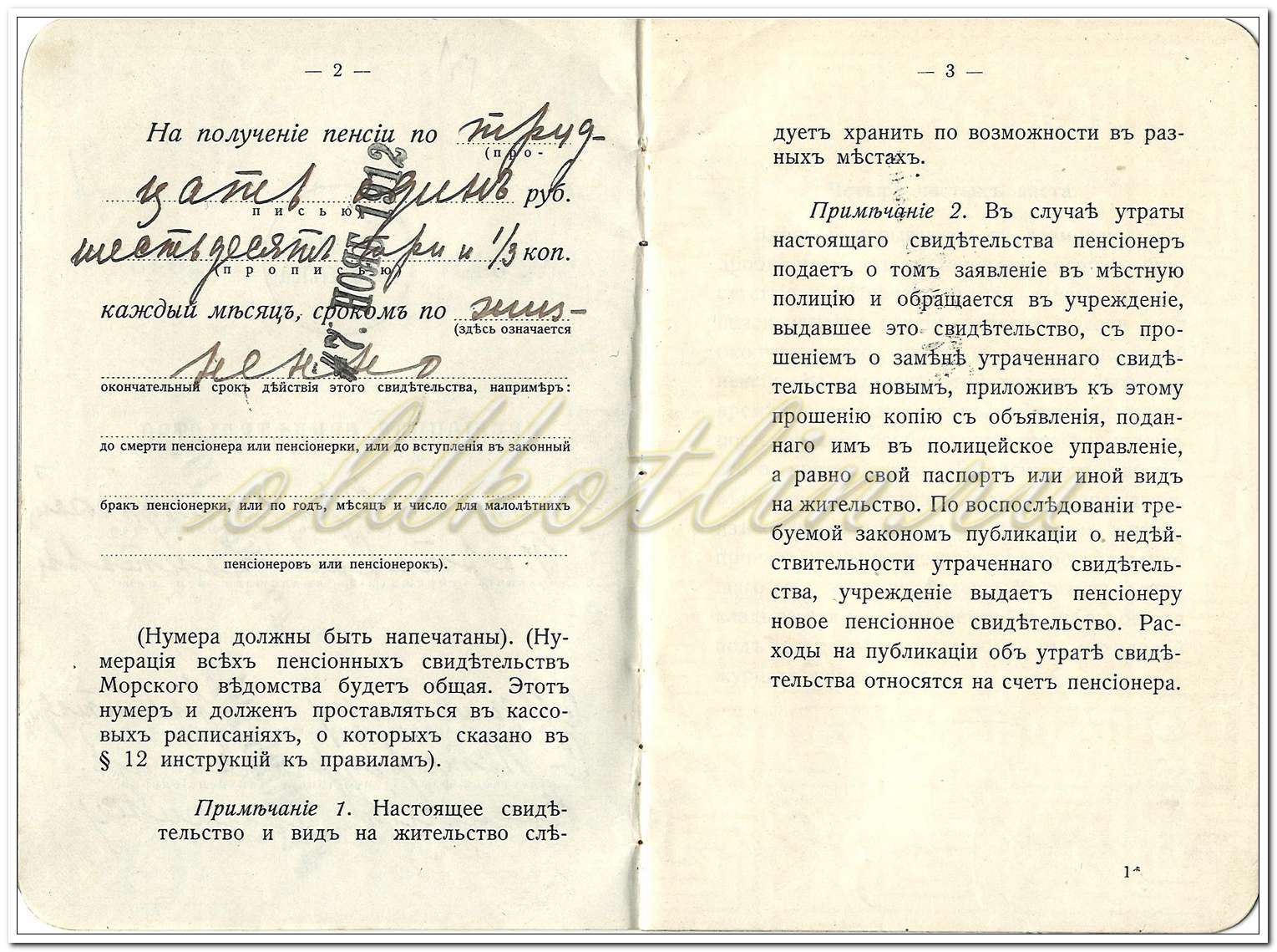 Примечание 2. В случае утраты настоящего свидетельства пенсионер подает о том заявление в местную полицию и обращается в учреждение, выдавшее это свидетельство, с прошением о замене утраченного свидетельства новым, приложив к этому прошению копию с объявления, поданного им в полицейское управление, а равно свой паспорт или иной вид на жительство. По воспоследовании требуемой законом публикации о недействительности утраченного свидетельства, учреждение выдает пенсионеру новое пенсионное свидетельство. Расходы на публикации об утрате свидетельства относятся на счет пенсионера.