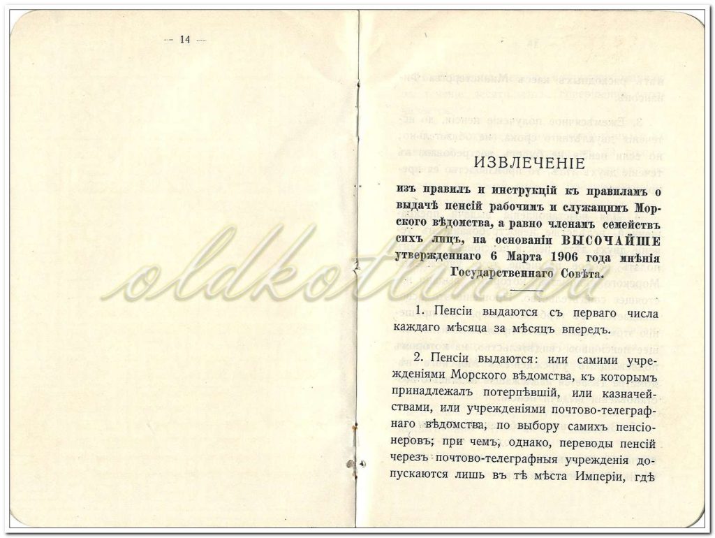 из правил и инструкций к правилам о выдаче пенсий рабочим и служащим Морского ведомства, а равно членам семейств сих лиц, на основании ВЫСОЧАЙШЕ утверждённого 6 Марта 1906 года мнения Государственного Совета.