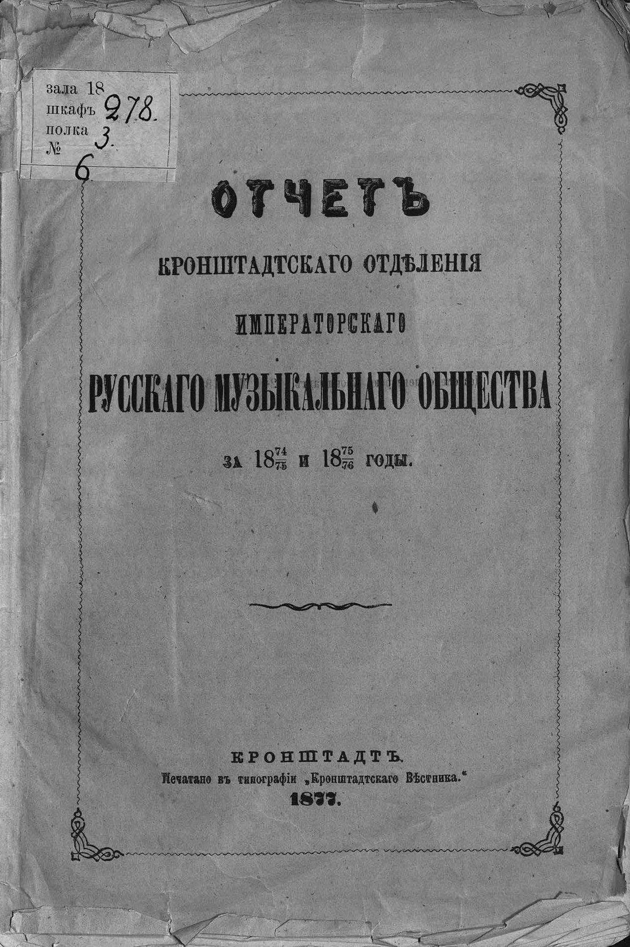 Обложка отчета Кронштадтского отделения Императорского русского музыкального общества за 1874/75 и 1875/76 г.г. Предоставлено РНБ.