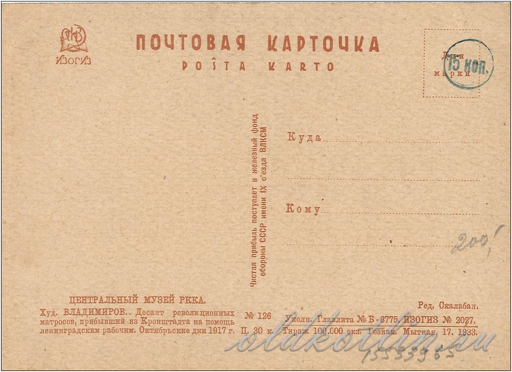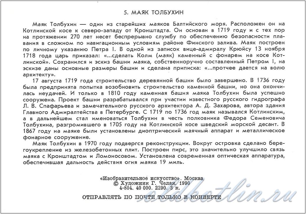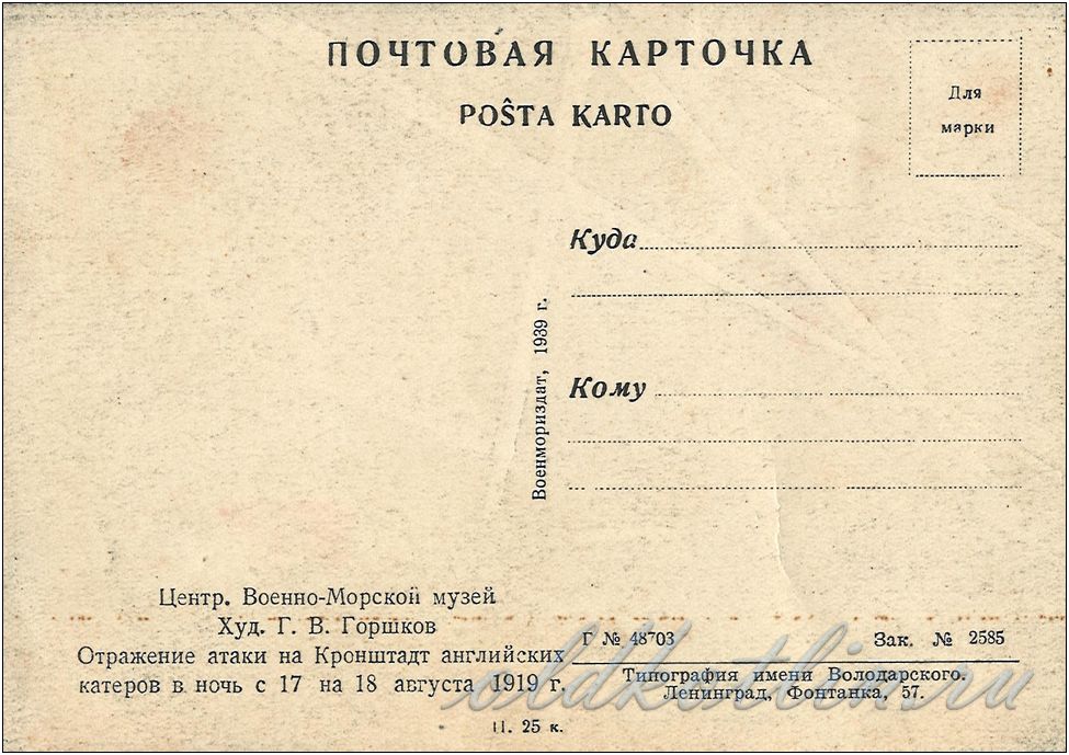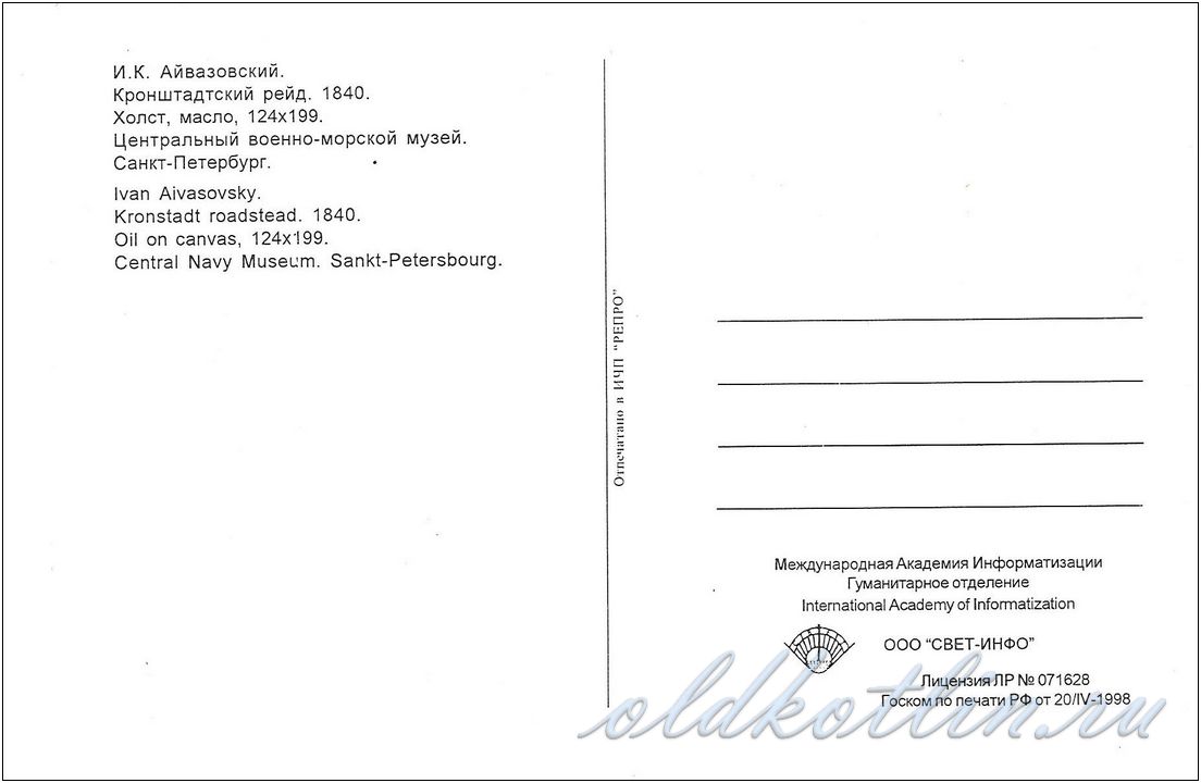 Открытки вне серий Открытки вне серий Открытки 20 века — времен СССР и единично РФ, не входящие в какие-либо серии и выпущенные отдельно. Десант революционных матросов, прибывших из Кронштадта на помощь Ленинградским рабочим. Октябрьские дни 1917 г. Выпущена — 1933 г.Десант революционных матросов. Обратная сторонаОтражение атаки на Кронштад английских катеров в ночь с 17 на 18 августа 1919 года. Выпущена — 1939 г.Отражение атаки на Кронштадт. Обратная сторонаПамятник адмиралу Макрову. Выпущена -1961 г.Памятник адмиралу Макрову. Обратная сторонаАйвазовский. Форт Меншикова. Выпущена — 1968 годАйвазовский. Форт Меншикова. Обратная сторонаПамятник Петру I в Приморском (так написано на открытке) парке. Выпущена — 1979 г.Памятник Петру I. Обратная сторонаМаяк Толбухин. Выпущена — 1990г.Маяк Толбухин. Обратная сторонаКронштадтский рейд. Айвазовский. Выпущена — 1998 г.Кронштадтский рейд. Айвазовский. Обратная сторонаКронштадт, 1959 г.На главнуюК списку kotlin_admin2026-01-09T19:16:54+03:00